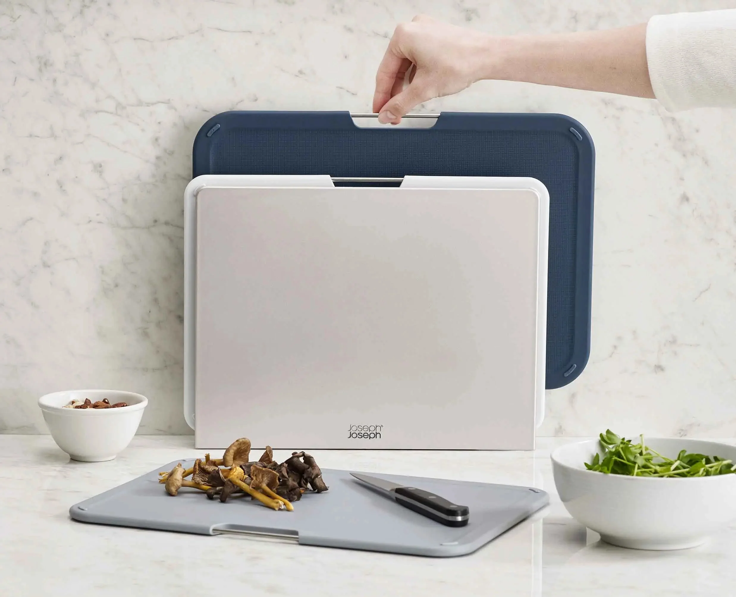 - Colour-coded chopping boards with non-slip feet